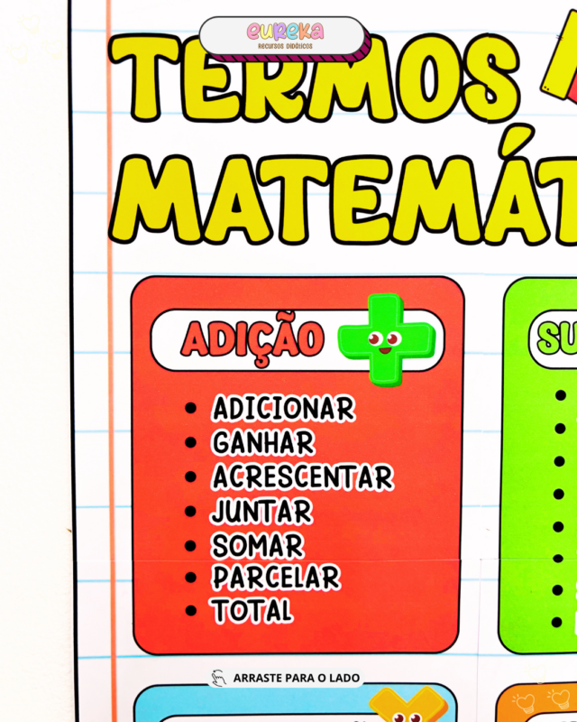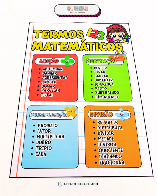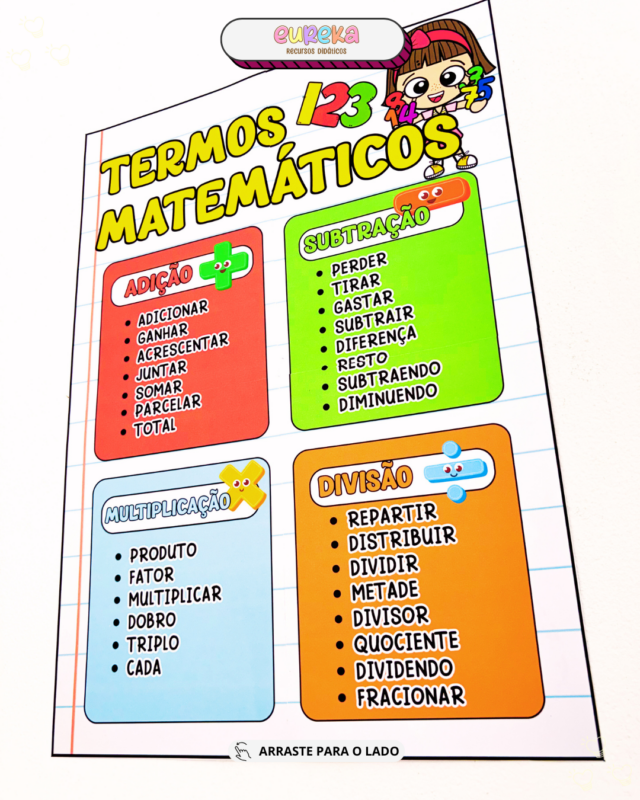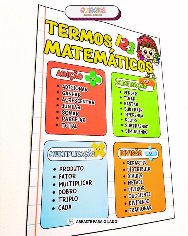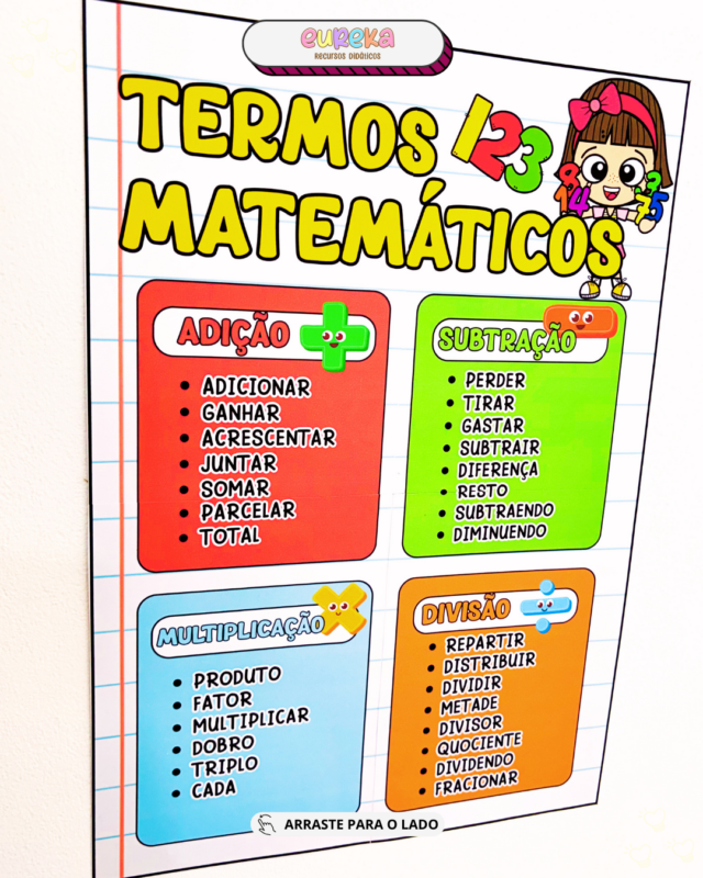 Com um formato visual e objetivo, o cartaz permite que a criança relacione conceitos, utilize corretamente a linguagem matemática e desenvolva mais segurança na resolução de problemas, evitando a simples memorização sem compreensão.