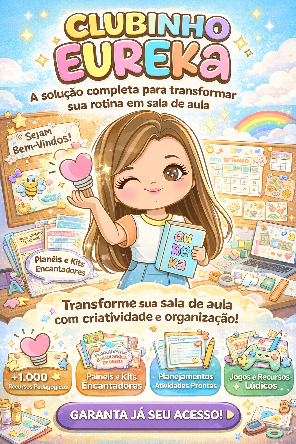 Tudo foi pensado para otimizar sua rotina, economizar tempo de planejamento e transformar sua sala de aula em um ambiente ainda mais organizado, criativo e encantador.