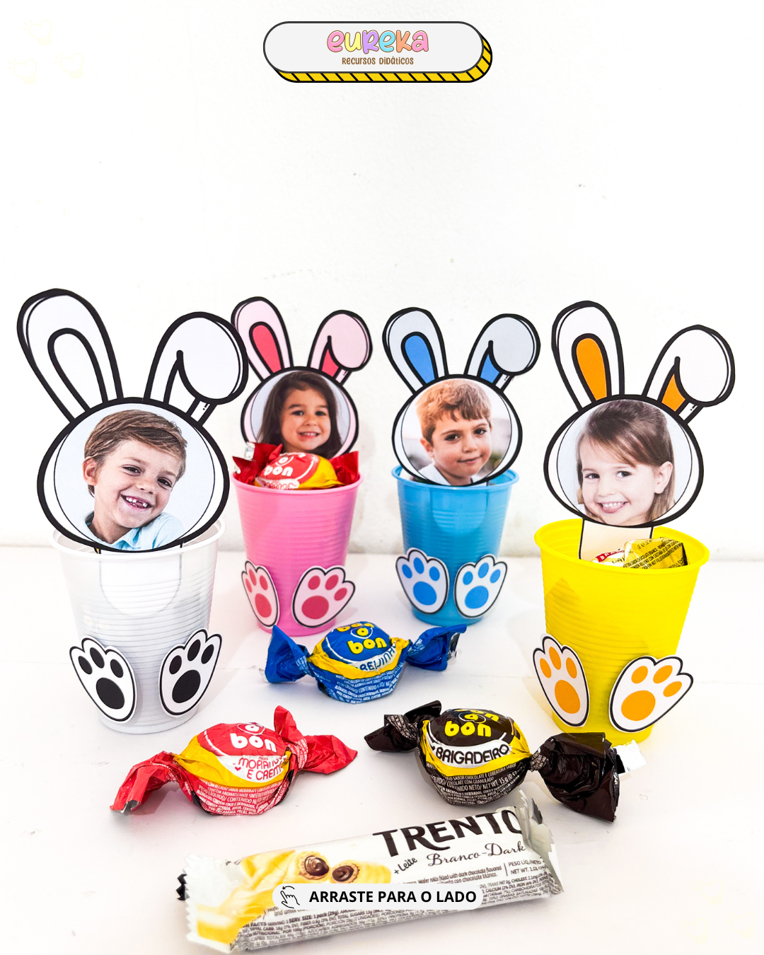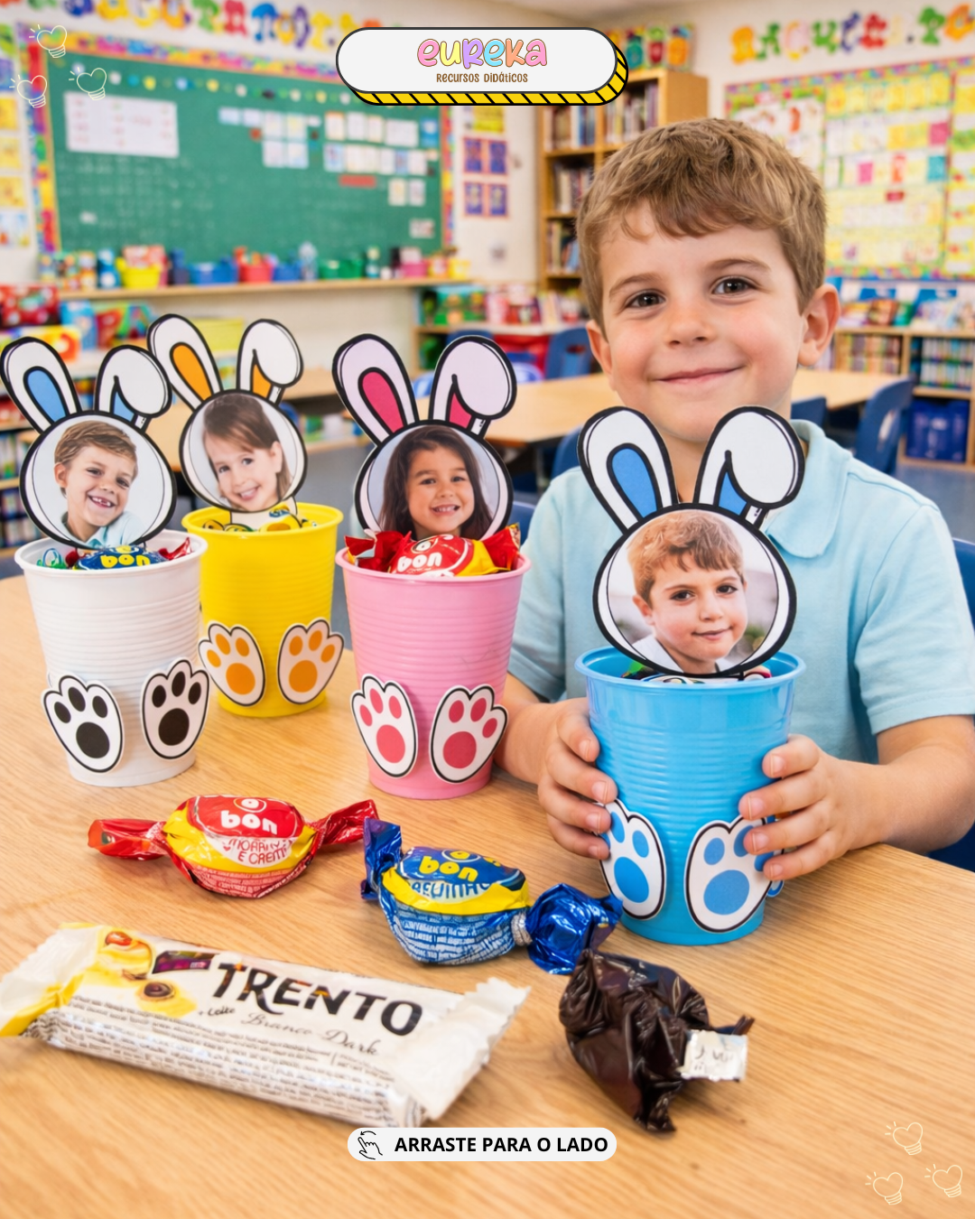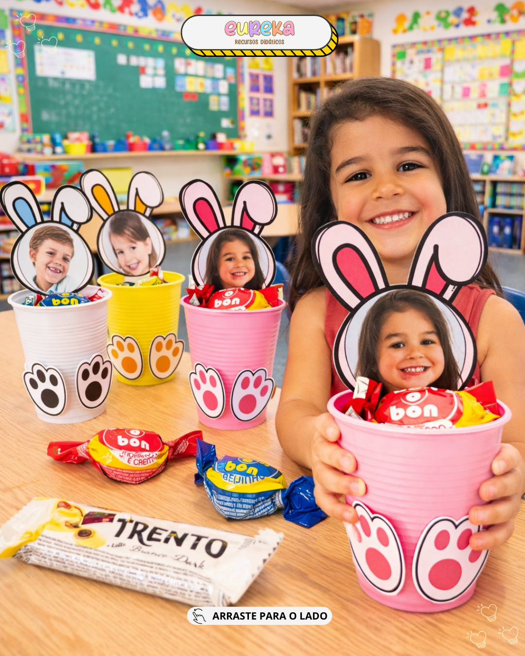 Os Copinhos de Páscoa foram pensados para transformar a entrega em uma experiência: a criança pinta, participa e monta sua própria lembrancinha.