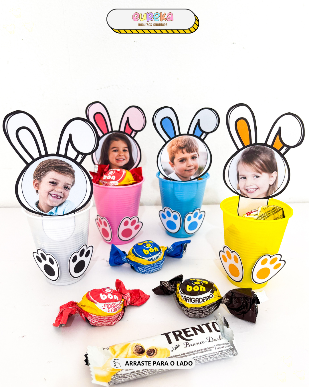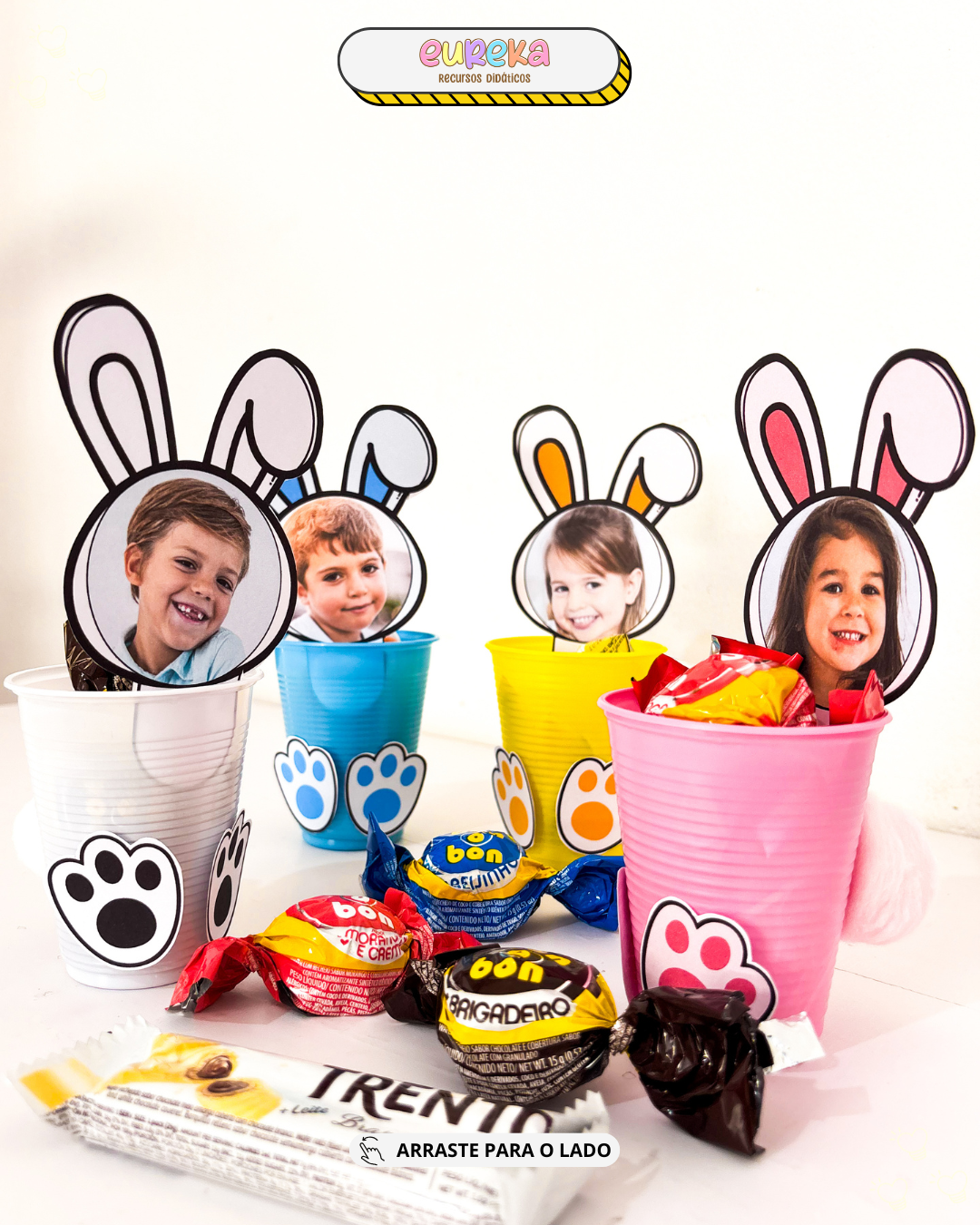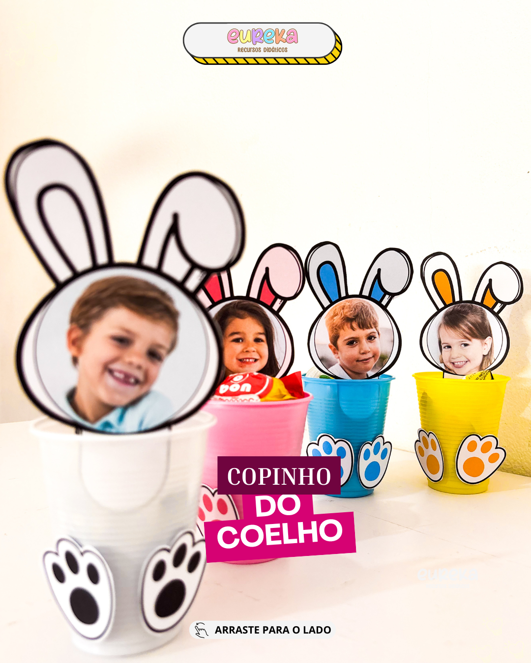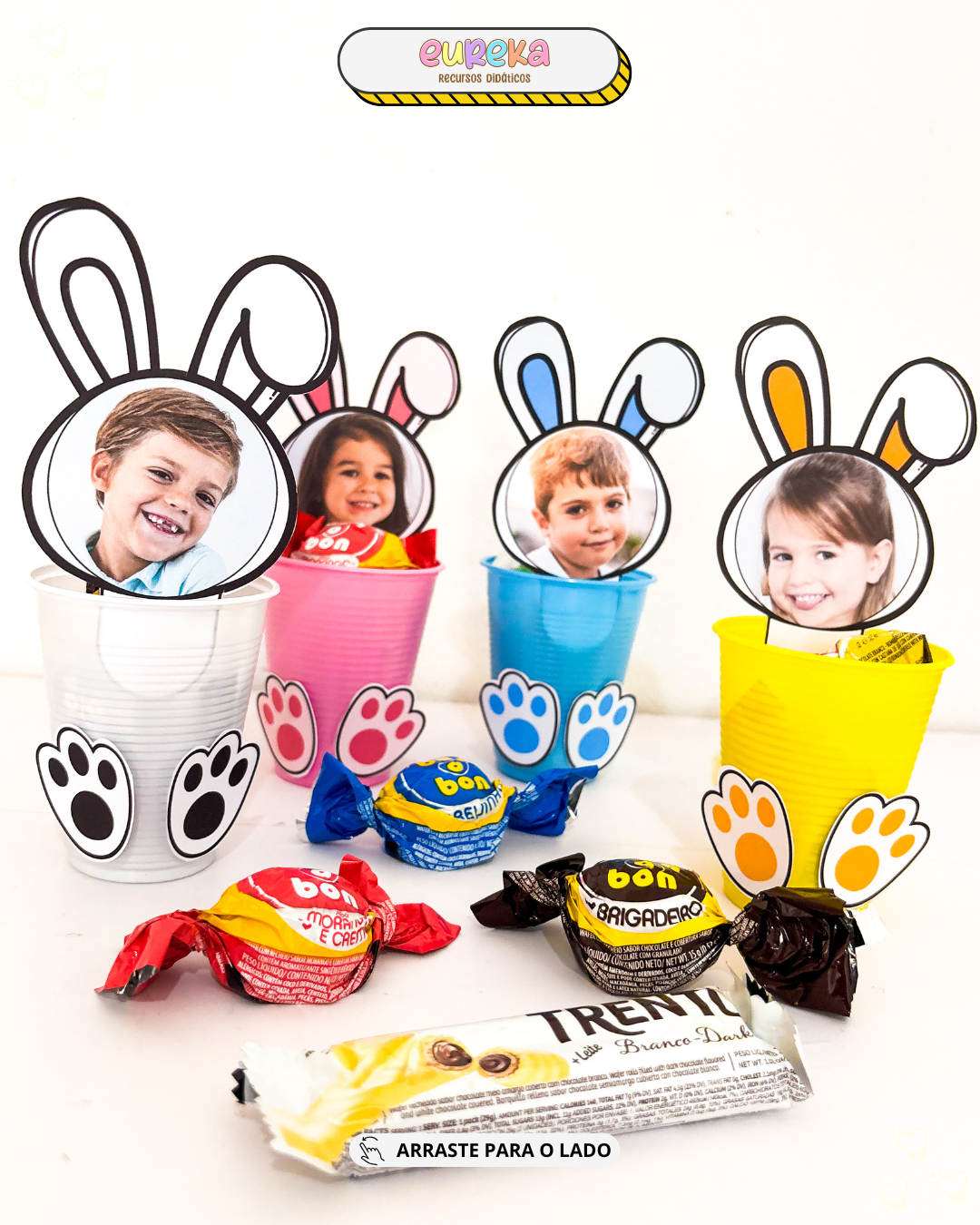 Os Copinhos de Páscoa foram pensados para transformar a entrega em uma experiência: a criança pinta, participa e monta sua própria lembrancinha.