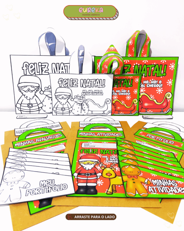 Capas e sacolas feitas com ilustrações natalinas alegres, pensadas para facilitar sua rotina e envolver os alunos no espírito festivo.