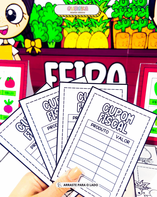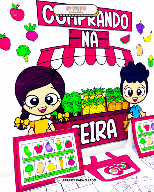 O material Comprando na Feira foi criado para proporcionar às crianças uma experiência lúdica, concreta e educativa, aproximando o aprendizado do cotidiano real.