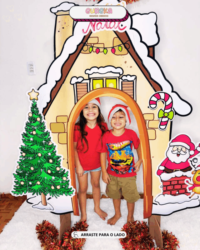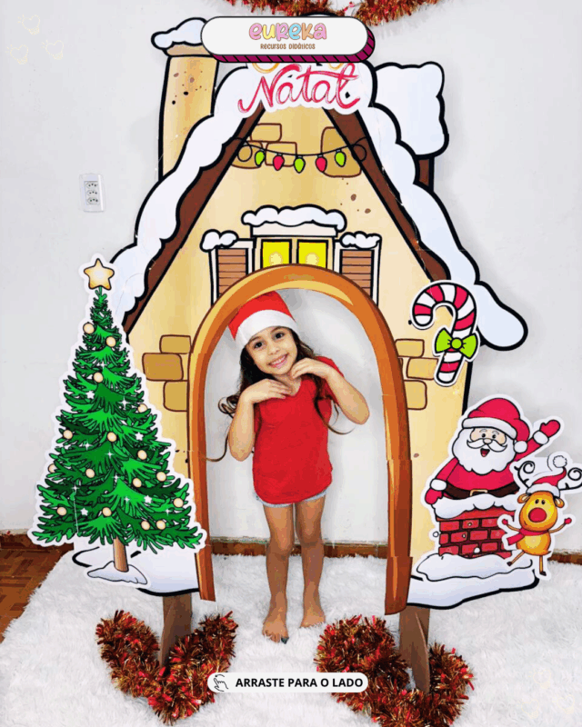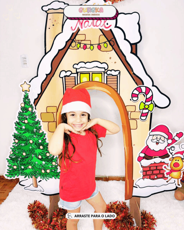 Moldura grande em formato de casinha decorada, com árvore de Natal, Papai Noel e detalhes temáticos encantadores.