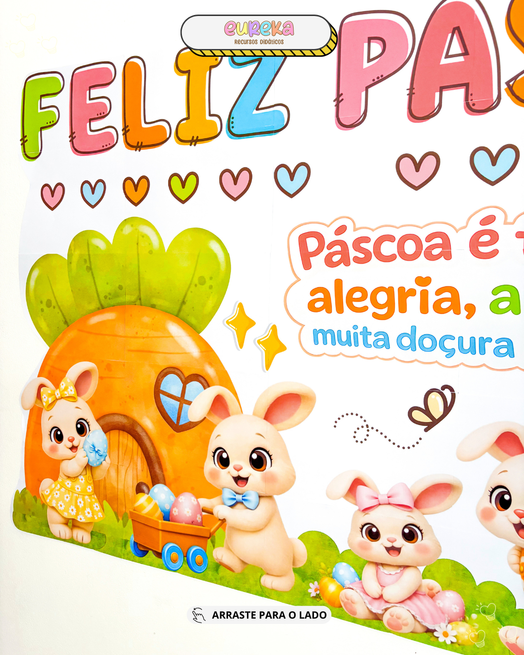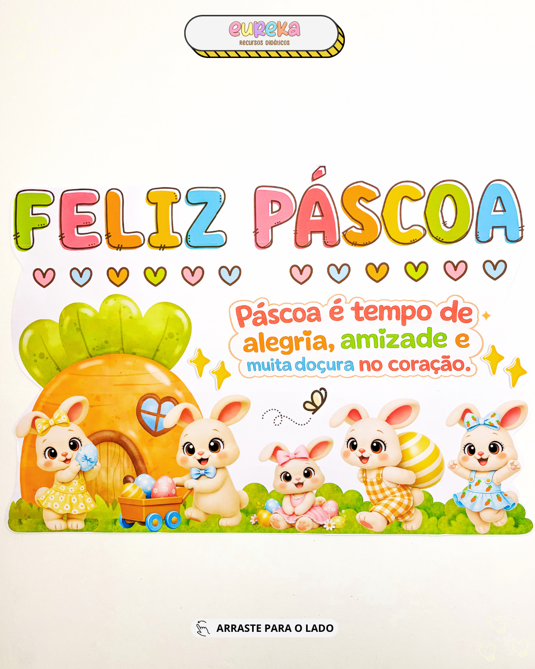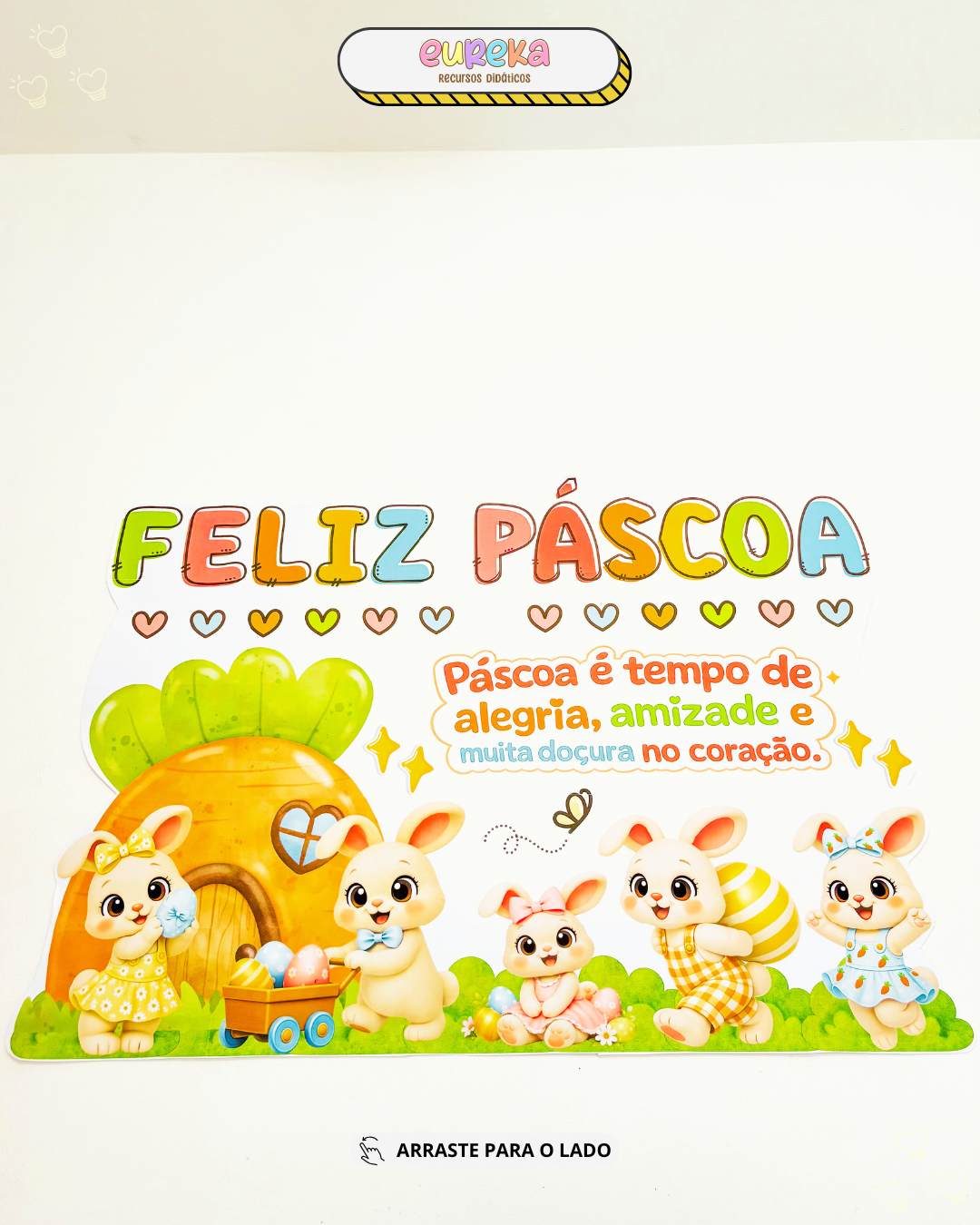 O Painel de Páscoa foi desenvolvido para transformar o espaço da sala em um cenário alegre, delicado e cheio de encanto, criando um ambiente acolhedor que envolve as crianças desde o primeiro olhar.