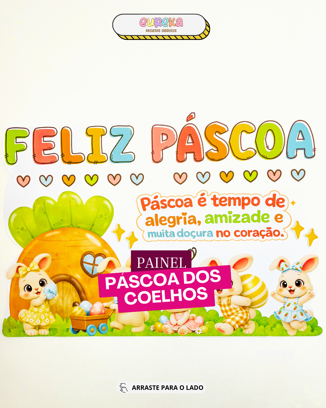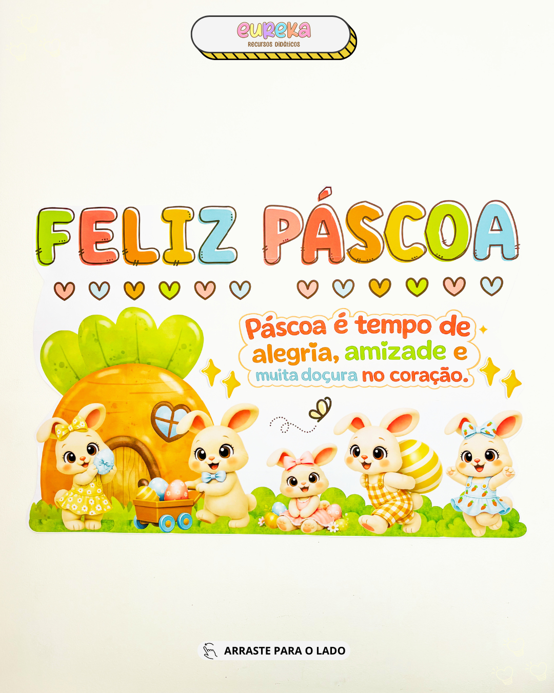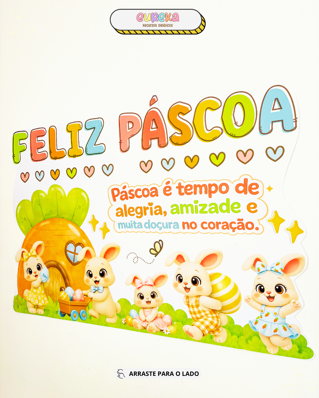 O Painel de Páscoa foi desenvolvido para transformar o espaço da sala em um cenário alegre, delicado e cheio de encanto, criando um ambiente acolhedor que envolve as crianças desde o primeiro olhar.