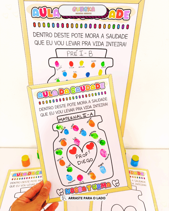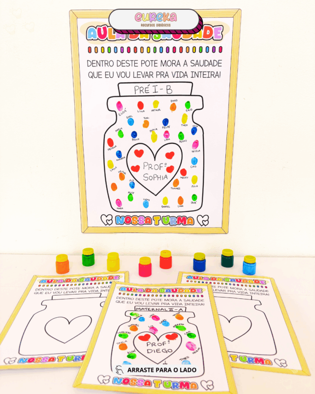 A proposta é simples, mas poderosa: cada criança coloca sua digital dentro do potinho ilustrado no cartaz, criando um registro único das marcas que ela deixa e leva do ano escolar.